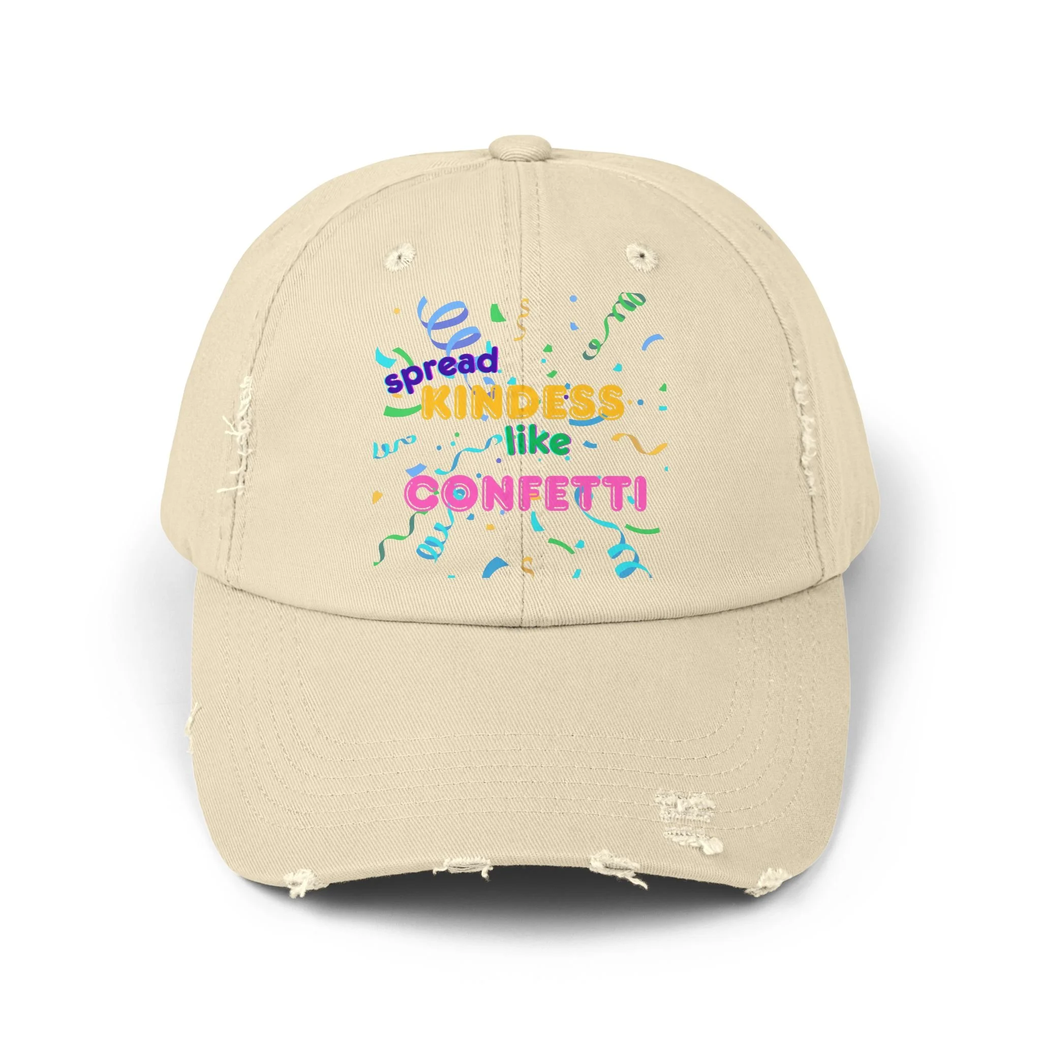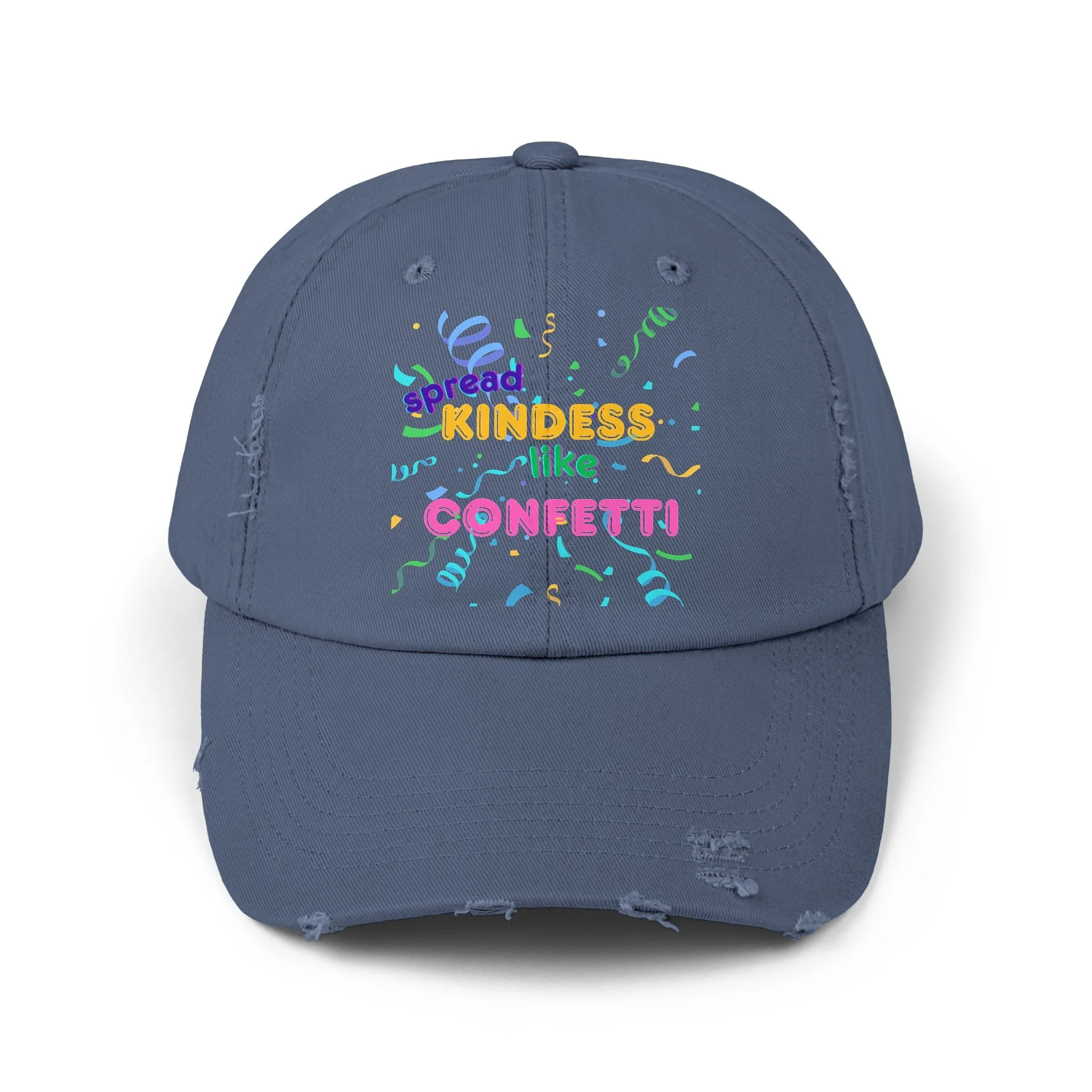 Spread kindness like confetti with this distressed cap, perfect for everyday wear. The vintage look and unique distressed elements add a touch of personality to your outfit. Ideal for those who appreciate a casual, laid-back style. Relevant for casual outings, festivals, and everyday wear.