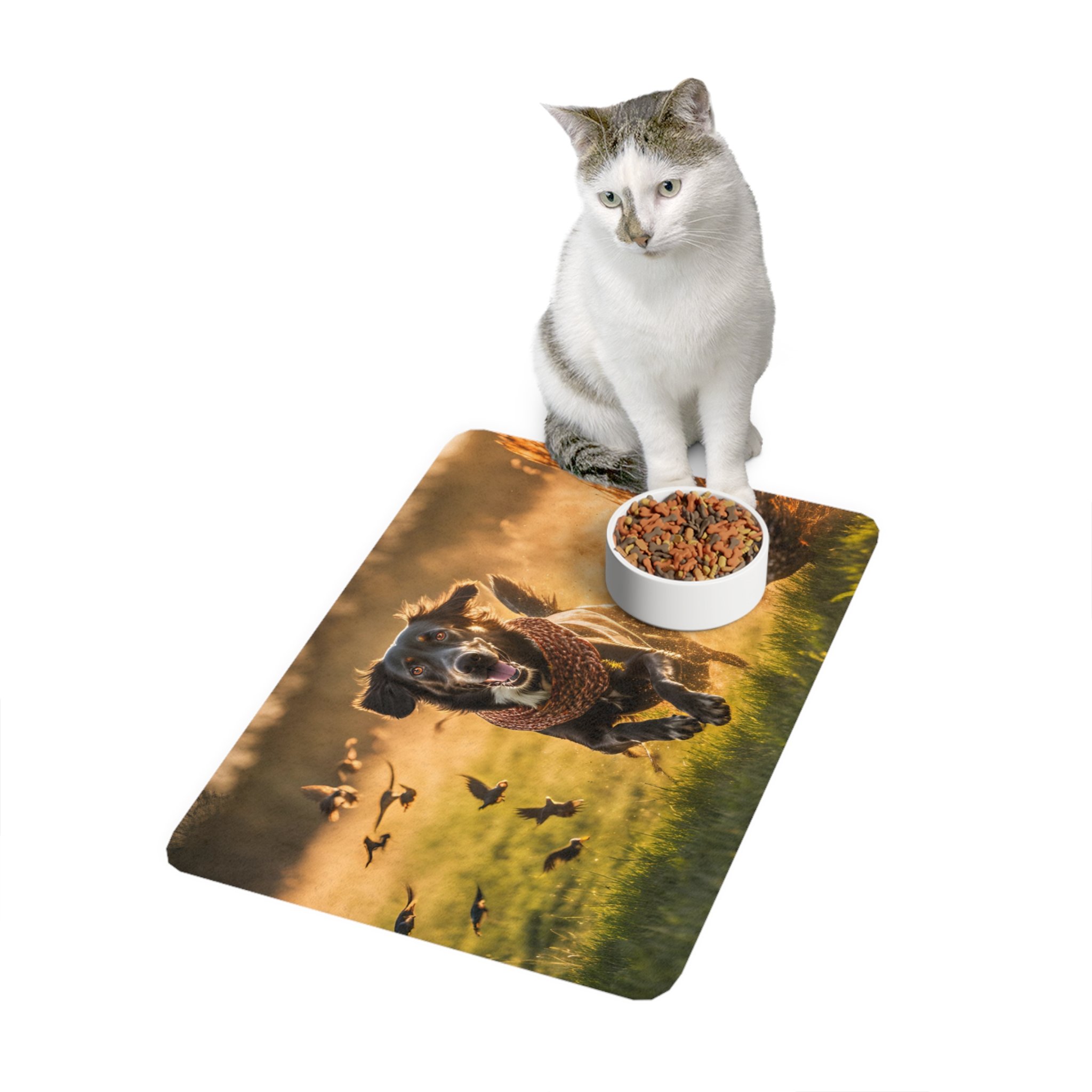 Created for minimizing mess, this personalized pet food mat is as practical as it is stylish. Made with a non-slip rubber base, this pet feeding mat stays put even when the clumsiest puppers are having their meal. Each mat comes in a rectangle shape, is thick, and is perfect for both dogs and cats. .: 100% polyester blend front .: 100% neoprene rubber back .: One size .: One-sided print .: Non-slip back .: Edge-to-edge full color surface