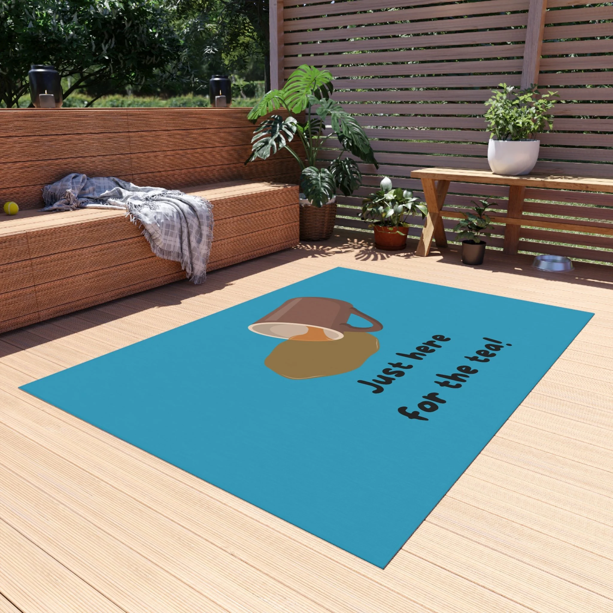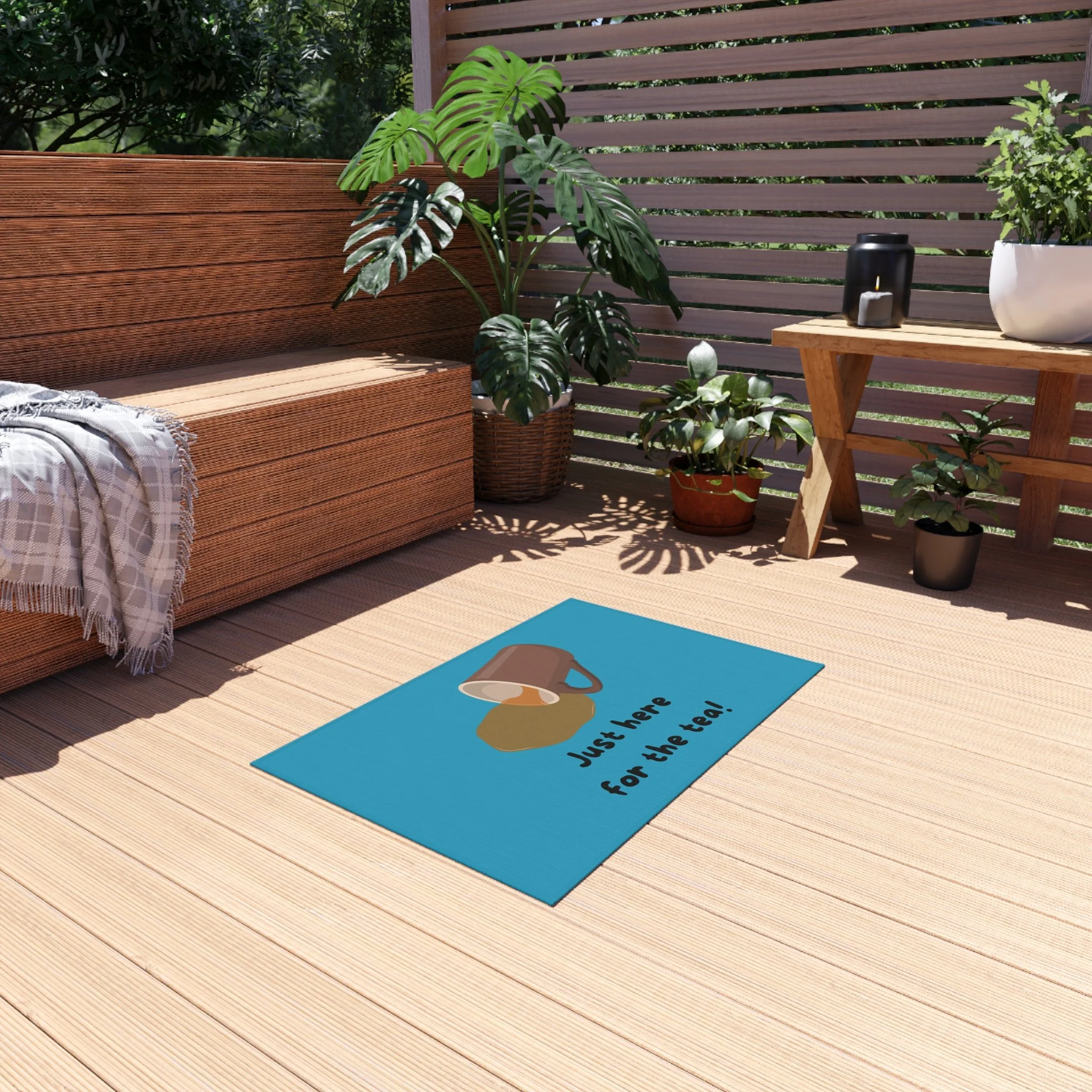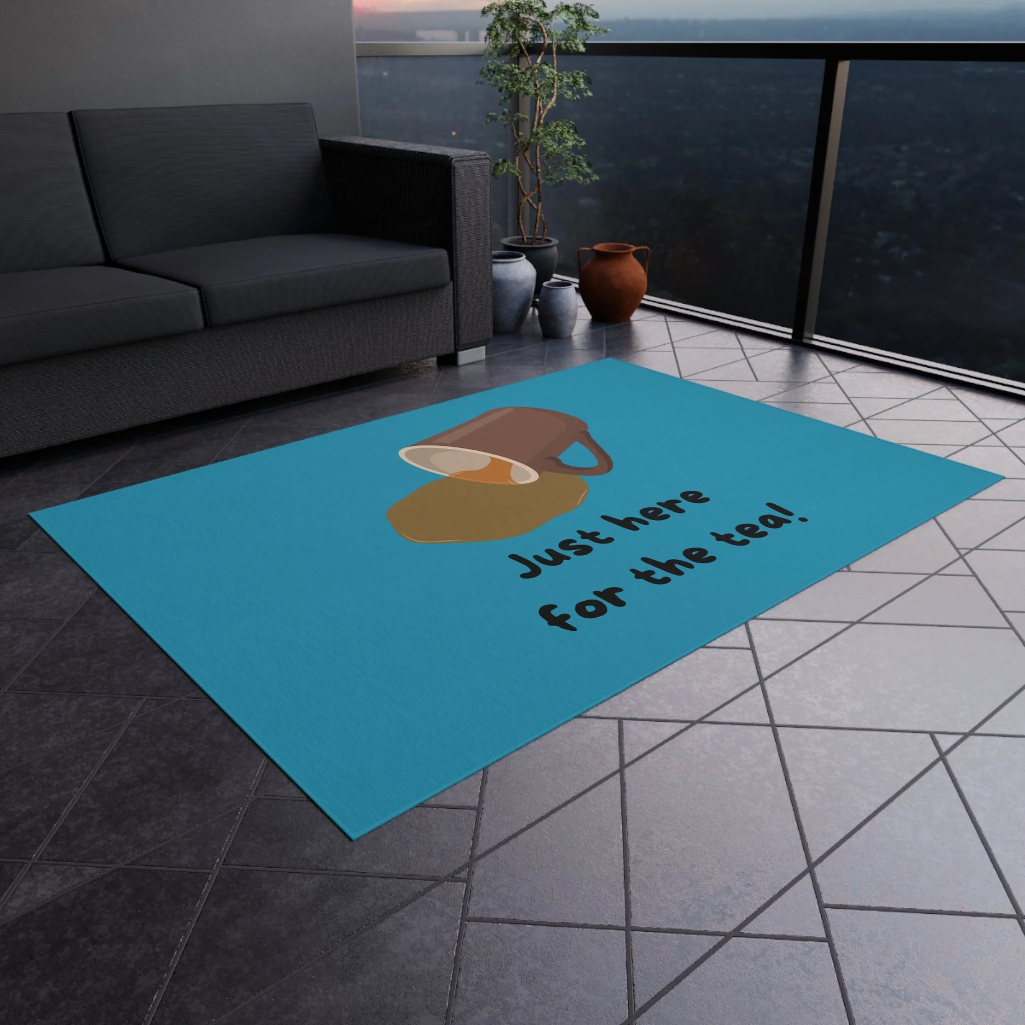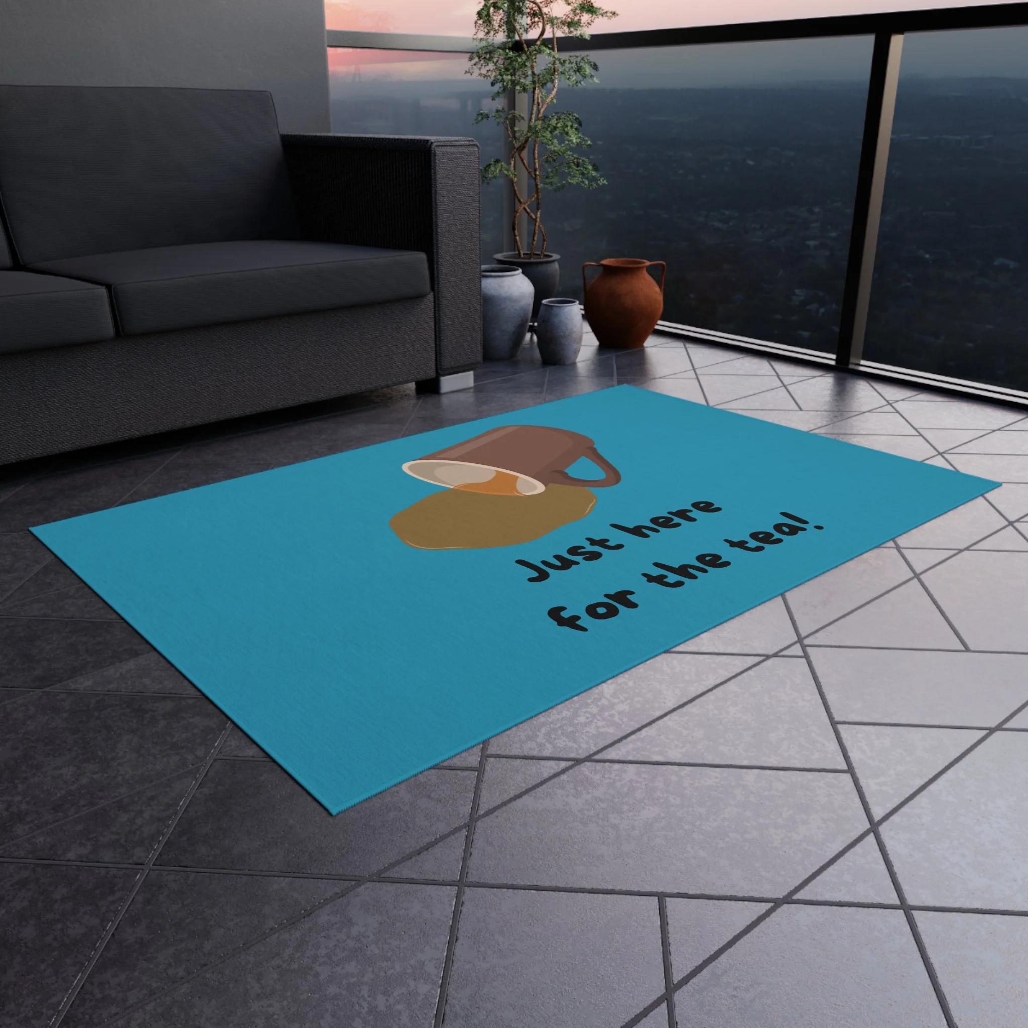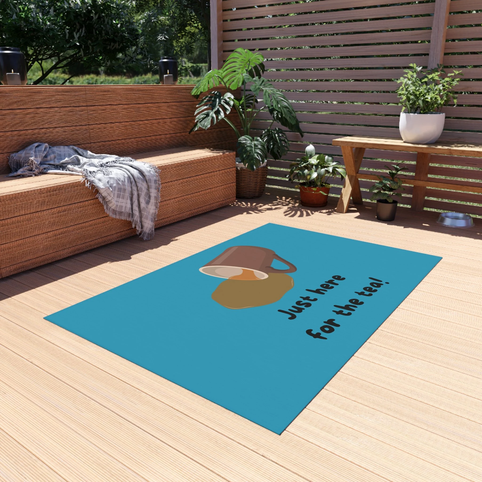 A welcoming outdoor rug design perfect for tea lovers. This rug adds a cozy and inviting touch to any porch or patio, setting a warm and inviting atmosphere. Ideal for those who enjoy spending time outdoors and want to add a personal touch to their outdoor space. Perfect for welcoming guests during tea parties, garden gatherings, and outdoor celebrations.
